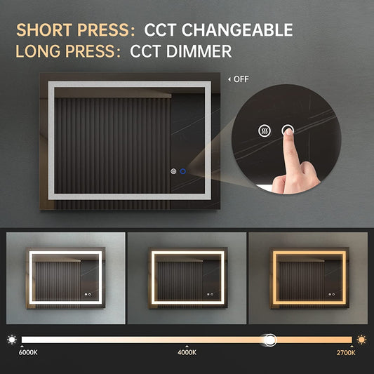 Modern LED Wall Mirror – 40"x24", Anti-Fog, Dimmable, Clear Glass